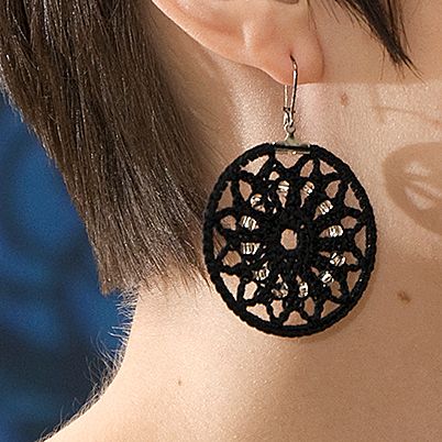 Merssi-puuvillalangasta virkatut mustat ja valkoiset korvarenkaat. Mustissa renkaissa somisteena helmiä ja valkoisissa heijastinlankaa.