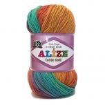 Lanka 40 g valkoista (55) ja 5 g vaaleanvihreää (612) Alize Cotton Gold -lankaa sekä 25 g moniväristä (4530) Alize Cotton Gold Batik -lankaa.