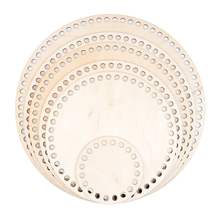 Käsittelemättömästä 3 mm puuvanerista laserleikattu korinpohja, reikien läpimitta 8mm. Seitsemän eri kokoa.