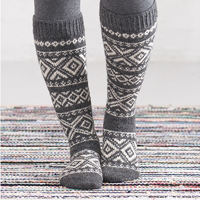Kirjoneulekuvioiset polvisukat Alizen Superwash -sukkalangasta. Nämä kauniit korkeavartiset villasukat on neulottu poikkeuksellisesti kärjestä aloittaen.