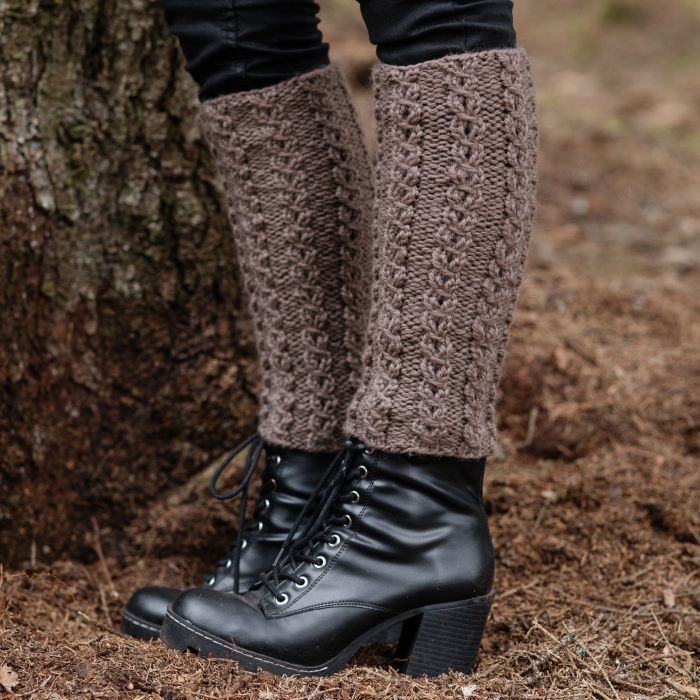 Benvärmare av tjockt Into-ullgarn. Den falska flätstickningen ger benvärmare en dekorativ yta. Kombinera med Kaarna tunika, halvvantar och hårband.