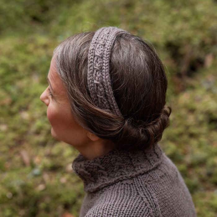 Ett tunt hårband stickas snabbt av tjockt Into-ullgarn. Den falska flätstickningen ger hårbandet en dekorativ yta. Kombinera med Kaarna tunika, benvärmare och halvvantar.