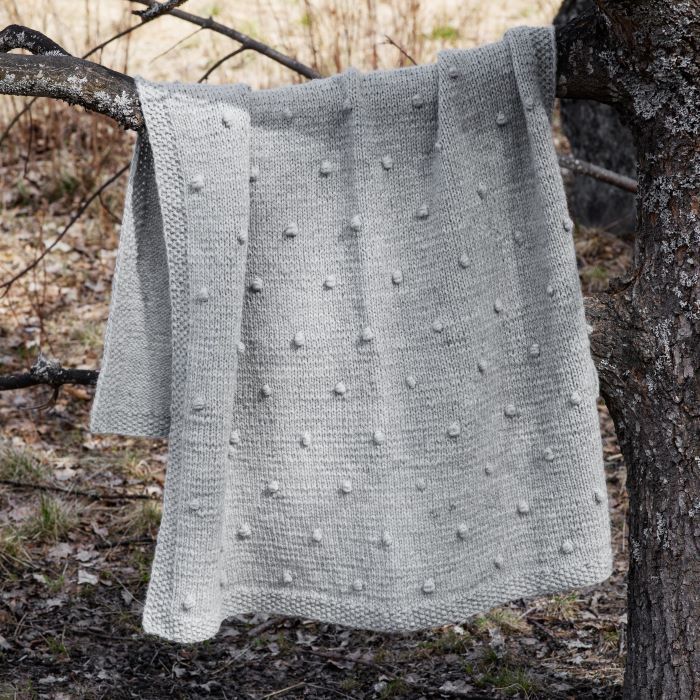 Vacker och mjuk filten stickas av Lankava Into-ullgarn. De små söta bollarna på ytan ger filten en vacker, livlig yta. Mönstret är enkelt och lätt att sticka.