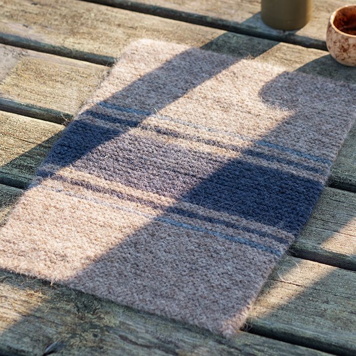 Garn: Istex Alafosslopi garn (100 % isländsk ull, 100 g = 100 m), 150 g oatmeal heather (0085), 50 g indigo (9959), 20 g light indigo (9958).