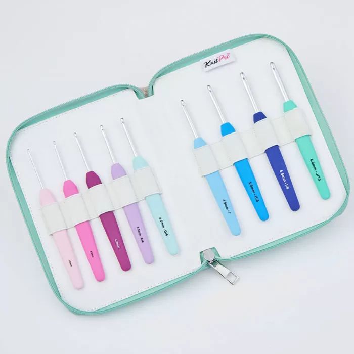 Waves 2.0 Deluxe är ett vackert och ergonomiskt virknålsset i läckra färger och ett praktiskt fodral med dragkedja för att hålla ordning på dina virknålar. Varje storlek har sin egen färg, så det är lätt att hitta den storlek du behöver. Waves 2.0 virknålen är tillverkade av aluminium, som är lätt och hållbart. Det ergonomiskt formade mjuka handtaget ger ett bekvämt grepp och minskar belastning och trötthet.